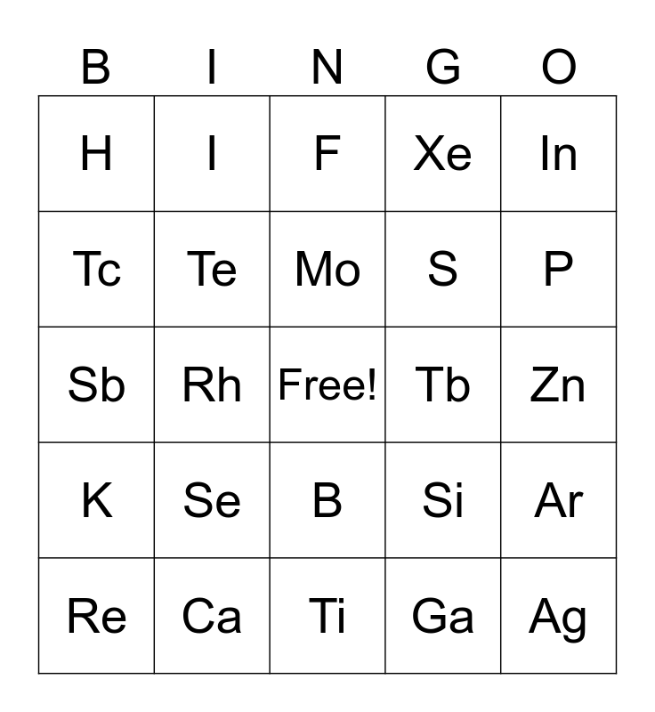 This bingo card has a free space and 75 words: Tm, Yb, F, Ne, Na, Br, Kr, Rb, Sr, Y, Zr, Nb, Mo, Tc, Ru, Rh, Pd, Ag, Cd, In, Sn, Sb, Te, I, Xe, Cs, Ba, La, Ce, Pr, Nd, Mg, Al, Si, P, S, Cl, Cu, Zn, Ga, Ge, As, Lu, Hf, Ta, W, Re, H, He, Li, Be, B, C, N, O, Cr, Mn, Fe, Co, Ni, Se, Pm, Sm, Eu, Gd, Tb, Dy, Ho, Er, Ar, K, Ca, Sc, Ti and V.
