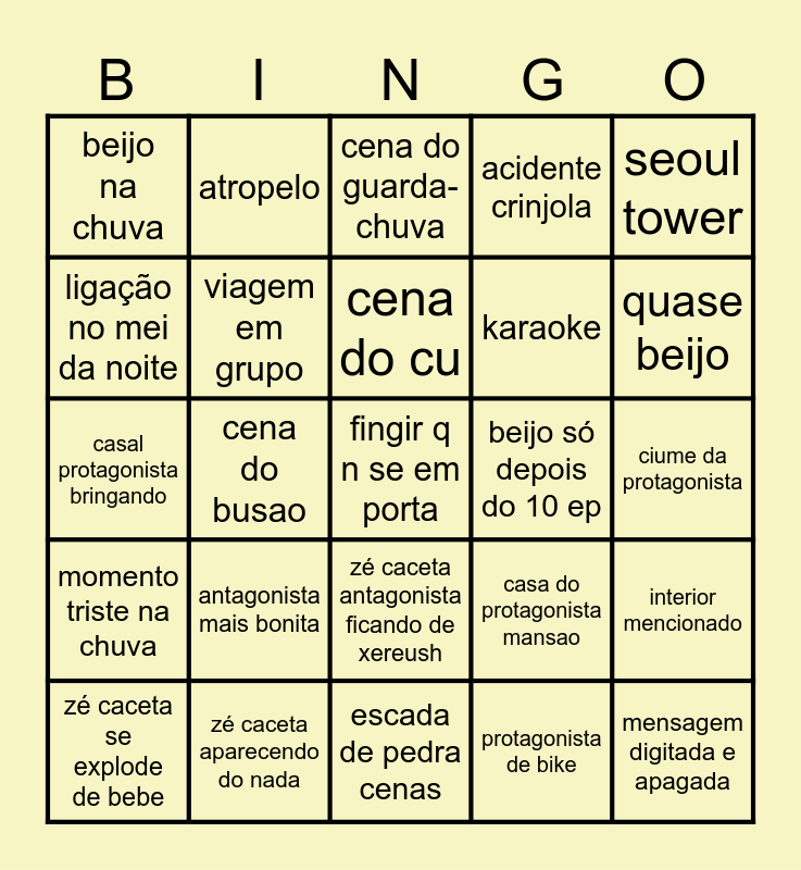 This bingo card has a free space and 24 words: antagonista mais bonita, zé caceta aparecendo do nada, cena do cu, zé caceta se explode de bebe, seoul tower, beijo na chuva, ligação no mei da noite, atropelo, beijo só depois do 10 ep, zé caceta antagonista ficando de xereush, karaoke, casal protagonista bringando, casa do protagonista mansao, interior mencionado, viagem em grupo, protagonista de bike, ciume da protagonista, cena do guarda-chuva, quase beijo, cena do busao, mensagem digitada e apagada, momento triste na chuva, acidente crinjola and escada de pedra cenas.