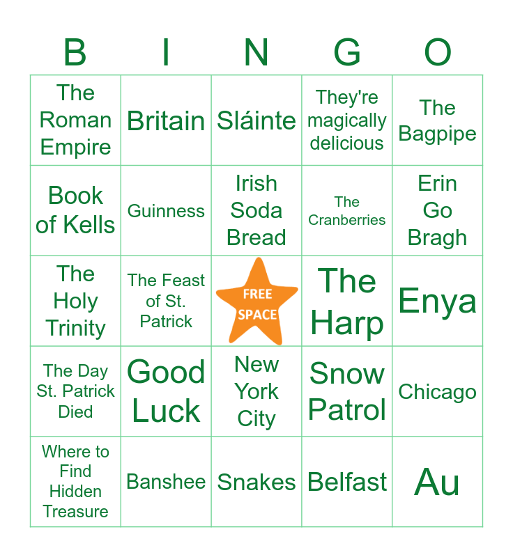 This bingo card has a free space and 44 words: Green, Au, Orange, Where to Find Hidden Treasure, Three, Belfast, Sláinte, Hozier, The Bagpipe, Banshee, They're magically delicious, The Harp, New York City, Good Luck, The Irish Rovers, Snakes, England, The Holy Trinity, Irish Stew, Erin Go Bragh, Britain, The Great Famine, Cork, The Roman Empire, Samhain, Enya, Dublin, A Pot of Gold, Snow Patrol, The Day St. Patrick Died, Gaelic Football, Chicago, Seamus Heaney, Irish Stepdance, The Feast of St. Patrick, Colcannon, Finn McCool, Liam Neeson, Irish Soda Bread, Book of Kells, The Cranberries, Wolfwalkers, Guinness and Sinéad O'Connor.
