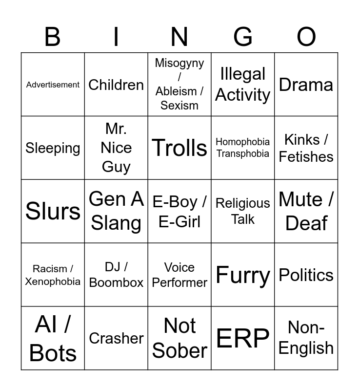 This bingo card has 25 words: DJ / Boombox, Not Sober, Trolls, AI / Bots, Drama, Advertisement, Sleeping, Children, Religious Talk, Voice Performer, Homophobia Transphobia, Slurs, Furry, Politics, Mr. Nice Guy, Non-English, Mute / Deaf, Misogyny / Ableism / Sexism, Kinks / Fetishes, Gen A Slang, E-Boy / E-Girl, Crasher, Racism / Xenophobia, Illegal Activity and ERP.