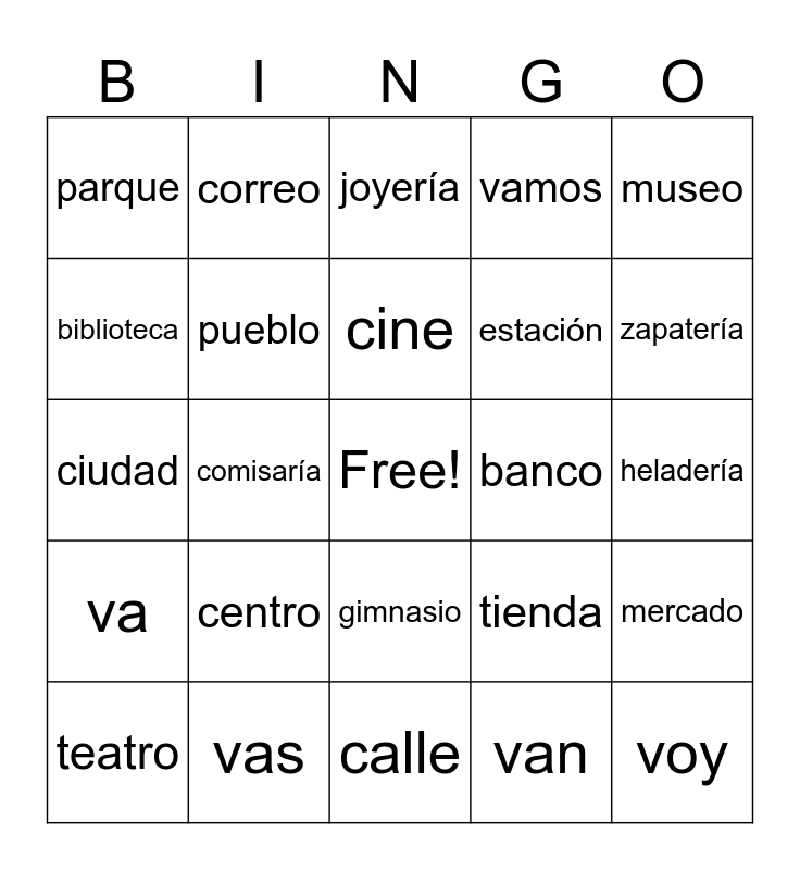 This bingo card has a free space and 25 words: centro, calle, cine, teatro, museo, parque, biblioteca, correo, banco, gimnasio, estación, ciudad, tienda, mercado, pueblo, panadería, heladería, joyería, zapatería, comisaría, voy, vas, va, vamos and van.