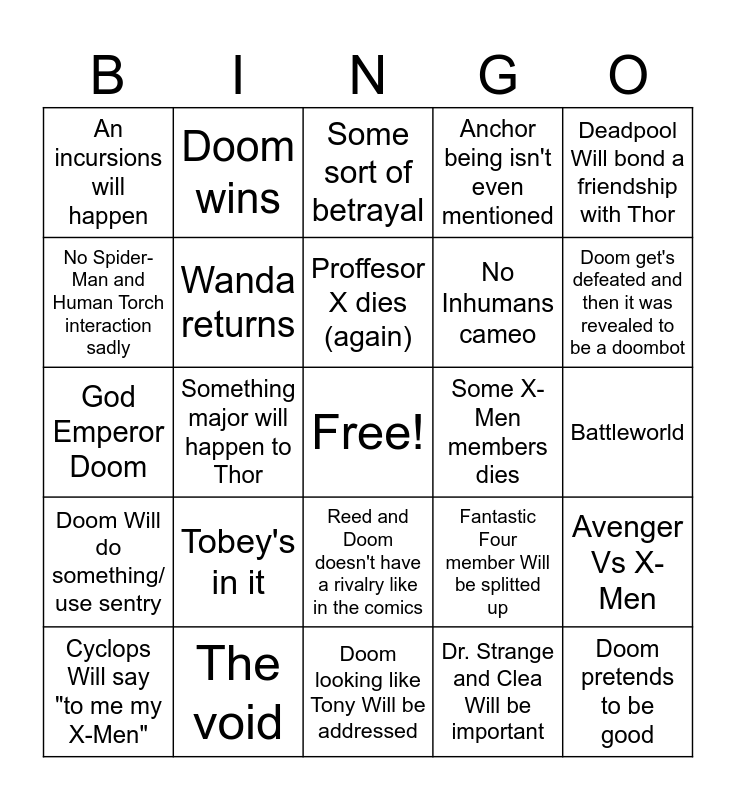 This bingo card has a free space and 24 words: Tobey's in it, The void, Proffesor X dies (again), Cyclops Will say "to me my X-Men", Deadpool Will bond a friendship with Thor, An incursions will happen, No Spider-Man and Human Torch interaction sadly, Doom wins, Some X-Men members dies, Reed and Doom doesn't have a rivalry like in the comics, No Inhumans cameo, God Emperor Doom, Fantastic Four member Will be splitted up, Avenger Vs X-Men, Wanda returns, Dr. Strange and Clea Will be important, Battleworld, Some sort of betrayal, Doom get's defeated and then it was revealed to be a doombot, Something major will happen to Thor, Doom pretends to be good, Doom Will do something/ use sentry, Anchor being isn't even mentioned and Doom looking like Tony Will be addressed.