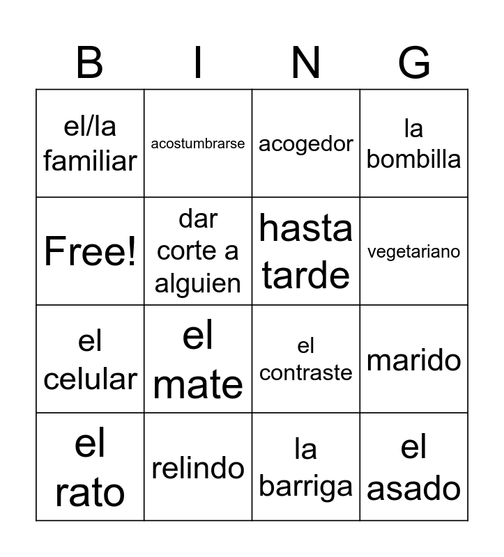 This bingo card has 16 words: relindo, marido, acogedor, el/la familiar, el celular, acostumbrarse, el contraste, la barriga, Free!, dar corte a alguien, el rato, la bombilla, el mate, vegetariano, hasta tarde and el asado.