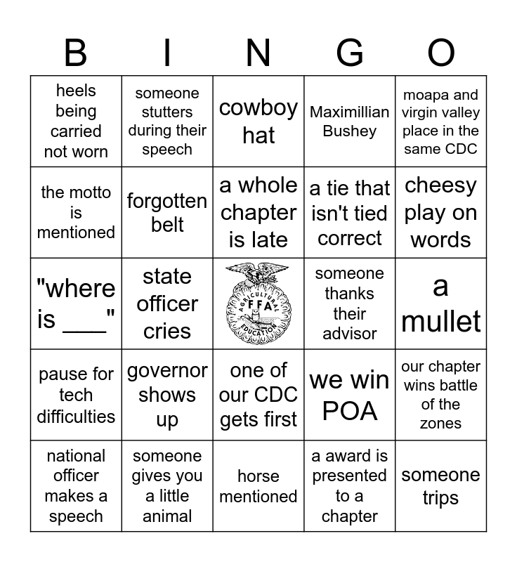 This bingo card has a free space and 24 words: governor shows up, someone gives you a little animal, a whole chapter is late, national officer makes a speech, moapa and virgin valley place in the same CDC, heels being carried not worn, the motto is mentioned, someone stutters during their speech, someone thanks their advisor, one of our CDC gets first, a tie that isn't tied correct, "where is ___", we win POA, our chapter wins battle of the zones, forgotten belt, a award is presented to a chapter, a mullet, cowboy hat, cheesy play on words, state officer cries, someone trips, pause for tech difficulties, Maximillian Bushey and horse mentioned.