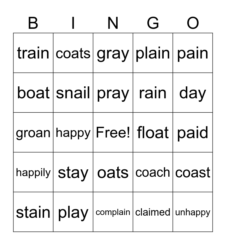 This bingo card has a free space and 24 words: stay, play, pray, stain, pain, train, boat, coats, float, oats, rain, groan, coach, coast, snail, claimed, paid, gray, day, happy, unhappy, happily, plain and complain.