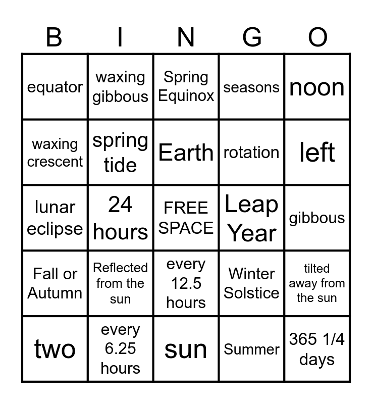 This bingo card has a free space and 56 words: orbit, two, hemispheres, equator, sun, moon, spring tide, gravity, rotation, ocean tides, seasons, neap tide, axis, revolution, 23.5 degrees, waning gibbous, noon, 24 hours, moon phases, 365 1/4 days, Leap Year, Summer Solstice, Winter Solstice, Spring Equinox, Fall or Autumnal Equinox, Earth, Counter-clockwise, right, left, full moon, new moon, waxing, waning, crescent, gibbous, waxing crescent, lunar eclipse, 3rd or Last Quarter, Fall or Autumn, waxing gibbous, every 12.5 hours, Day & Night, waning crescent, solar eclipse, Winter, Reflected from the sun, every 6.25 hours, Spring, about one month, 1st Quarter, Summer, half, lunar cycle, equinox, tilted away from the sun and tilted toward the sun.