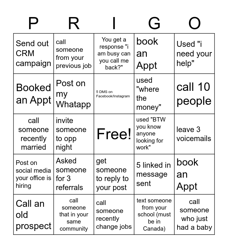 This bingo card has a free space and 24 words: Asked someone for 3 referrals, call someone that in your same community, 5 DMS on Facebook/Instagram, Call an old prospect, Used "i need your help", Send out CRM campaign, Booked an Appt, call someone from your previous job, used "BTW you know anyone looking for work", get someone to reply to your post, used "where the money", call someone recently married, 5 linked in message sent, book an Appt, Post on my Whatapp, text someone from your school (must be in Canada), leave 3 voicemails, You get a response "i am busy can you call me back?", call 10 people, invite someone to opp night, call someone who just had a baby, Post on social media your office is hiring, book an Appt and call someone recently change jobs.