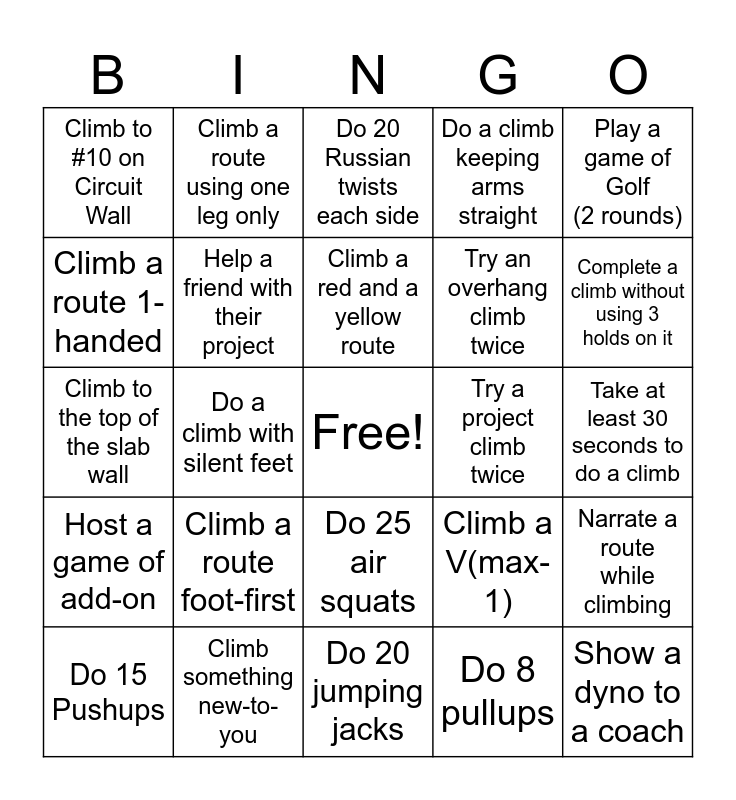This bingo card has a free space and 24 words: Climb a route foot-first, Climb something new-to-you, Climb a red and a yellow route, Do 15 Pushups, Play a game of Golf (2 rounds), Climb to #10 on Circuit Wall, Climb a route 1-handed, Climb a route using one leg only, Try a project climb twice, Do 25 air squats, Try an overhang climb twice, Climb to the top of the slab wall, Climb a V(max-1), Narrate a route while climbing, Help a friend with their project, Do 8 pullups, Take at least 30 seconds to do a climb, Do 20 Russian twists each side, Complete a climb without using 3 holds on it, Do a climb with silent feet, Show a dyno to a coach, Host a game of add-on, Do a climb keeping arms straight and Do 20 jumping jacks.