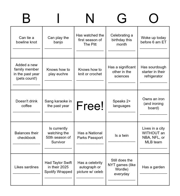 This bingo card has a free space and 44 words: Served in the Peace Corps _____________, Has a garden _____________, Doesn't have Instagram, Facebook, BlueSky, or Twitter _____________, Likes sardines _____________, Same birth month as you (host) _____________, Still does the NYT games (like Wordle) everyday _____________, Has watched the first season of The Pitt _____________, Has a Stanley or Owala waterbottle _____________, Woke up today before 6 am ET _____________, Had Taylor Swift in their 2025 Spotify Wrapped _____________, Celebrating a birthday this month _____________, Speaks 2+ languages _____________, Has a National Parks Passport _____________, Is currently watching the 50th season of Survivor _____________, Has a tattoo _____________, Has a celebrity autograph or picture w/ celeb _____________, Has made a souffle _____________, Doesn't drink coffee _____________, Can drive a manual transmission car _____________, Has sourdough starter in their refrigerator _____________, Can play the banjo _____________, Has more than 3 pets _____________, Visted one of the seven wonders of the world _____________, Can tie a bowline knot _____________, Actually makes a food shopping list _____________, Owns an iron (and ironing board) _____________, Is left-handed _____________, Is a student of American Sign Language _____________, Is a twin _____________, Balances their checkbook _____________, Remembers their childhood phone number _____________, Lives in a city WITHOUT an NBA, NFL, or MLB team _____________, Keeps 20+ tabs open on a laptop _____________, Saw both Wicked movies _____________, Sang karaoke in the past year _____________, Has an electric or hybrid car _____________, Has watched KPop Demon Hunters _____________, Has worked for Woodwell for 5+ years _____________, Knows how to knit or crochet _____________, Added a new family member in the past year (pets count!) _____________, Has a significant other in the sciences _____________, Knows how to play backgammon _____________, Knows how to play euchre _____________ and Owns a nintendo switch (or xbox or gaming pc, etc) _____________.