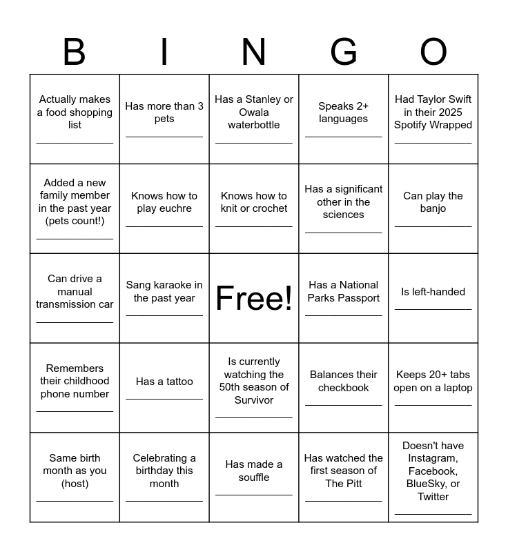 This bingo card has a free space and 43 words: Has a garden _____________, Doesn't have Instagram, Facebook, BlueSky, or Twitter _____________, Likes sardines _____________, Same birth month as you (host) _____________, Still does the NYT games (like Wordle) everyday _____________, Has watched the first season of The Pitt _____________, Has a Stanley or Owala waterbottle _____________, Woke up today before 6 am ET _____________, Had Taylor Swift in their 2025 Spotify Wrapped _____________, Celebrating a birthday this month _____________, Speaks 2+ languages _____________, Has a National Parks Passport _____________, Is currently watching the 50th season of Survivor _____________, Has a tattoo _____________, Has a celebrity autograph or picture w/ celeb _____________, Has made a souffle _____________, Doesn't drink coffee _____________, Can drive a manual transmission car _____________, Has sourdough starter in their refrigerator _____________, Can play the banjo _____________, Has more than 3 pets _____________, Visted one of the seven wonders of the world _____________, Can tie a bowline knot _____________, Actually makes a food shopping list _____________, Owns an iron (and ironing board) _____________, Is left-handed _____________, Is a student of American Sign Language _____________, Is a twin _____________, Balances their checkbook _____________, Remembers their childhood phone number _____________, Lives in a city WITHOUT an NBA, NFL, or MLB team _____________, Keeps 20+ tabs open on a laptop _____________, Saw both Wicked movies _____________, Sang karaoke in the past year _____________, Has an electric or hybrid car _____________, Has watched KPop Demon Hunters _____________, Has worked for Woodwell for 5+ years _____________, Knows how to knit or crochet _____________, Added a new family member in the past year (pets count!) _____________, Has a significant other in the sciences _____________, Knows how to play backgammon _____________, Knows how to play euchre _____________ and Owns a nintendo switch (or xbox or gaming pc, etc) _____________.