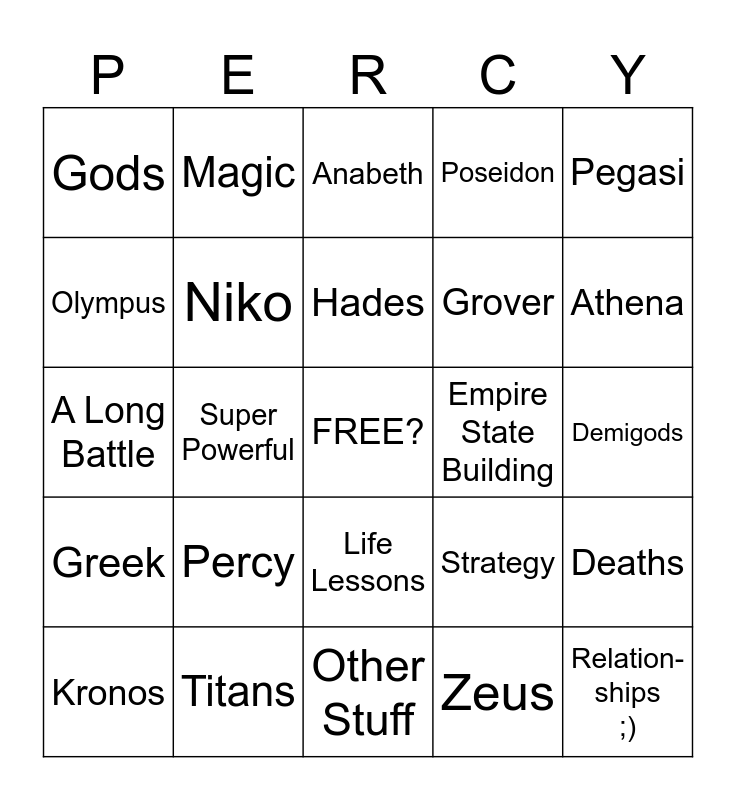 This bingo card has a free space and 24 words: Percy, Titans, Hades, Kronos, Pegasi, Gods, Olympus, Magic, Empire State Building, Life Lessons, Grover, A Long Battle, Strategy, Deaths, Niko, Zeus, Demigods, Anabeth, Athena, Super Powerful, Relation- ships ;), Greek, Poseidon and Other Stuff.