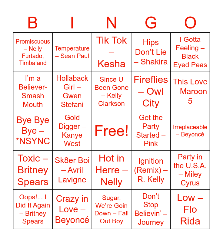 This bingo card has a free space and 40 words: Yeah! – Usher, Bye Bye Bye – *NSYNC, No Scrubs – TLC, Hollaback Girl – Gwen Stefani, Crazy in Love – Beyoncé, Hot in Herre – Nelly, Since U Been Gone – Kelly Clarkson, Mr. Brightside – The Killers, I Gotta Feeling – Black Eyed Peas, Toxic – Britney Spears, Gold Digger – Kanye West, Hips Don’t Lie – Shakira, Low – Flo Rida, Irreplaceable – Beyoncé, Get the Party Started – Pink, Sk8er Boi – Avril Lavigne, SexyBack – Justin Timberlake, Promiscuous – Nelly Furtado, Timbaland, All the Small Things – Blink-182, Tik Tok – Kesha, Party in the U.S.A. – Miley Cyrus, Don’t Stop Believin’ – Journey, Fireflies – Owl City, I’m a Believer- Smash Mouth, Lady Gaga- Poker Face, Jenny From the Block - Jennifer Lopez, Mambo #5 - Lou Bega, Jump - Kris Kross, What’s Luv? - Fat Joe, Ja Rule Ashanti, Suga, Suga - Baby Bash, Baby One More Time – Britney Spears, Oops!... I Did It Again – Britney Spears, Hey Ya! – OutKast, Ignition (Remix) – R. Kelly, This Love – Maroon 5, Sugar, We’re Goin Down – Fall Out Boy, Complicated – Avril Lavigne, Whenever, Wherever – Shakira, Temperature – Sean Paul and Lean Back – Terror Squad.