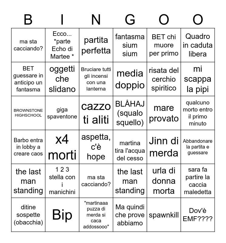 This bingo card has 36 words: the last man standing, ma sta cacciando?, Ma quindi che prove abbiamo, BET guessare in anticipo un fantasma, Barbo entra in lobby a creare caos, BLÅHAJ (squalo squello), oggetti che slidano, "martinaaa puzza di merda si caca addossooo", BET chi muore per primo, urla di donna morta, mi scappa la pipi, fantasma sium sium, sara fa partire la caccia maledetta, giga spaventone, media doppio, ma sta cacciando?, the last man standing, mare provato, BROWNSTONE HIGHSCHOOL, partita perfetta, cazzo ti aliti, x4 morti, martina tira l'acqua del cesso, aspetta, c'è hope, Jinn di merda, Ecco... *parte Echo di Martee *, risata del cerchio spiritico, Bip, Bruciare tutti gli incensi con una lanterna, Quadro in caduta libera, Dov'è EMF????, ditine sospette (obacchia), Abbandonare la partita e guessare, qualcuno morto entro il primo minuto, 1 2 3 stella con i manichini and spawnkill.