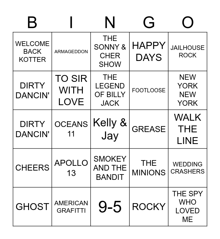 This bingo card has a free space and 69 words: TOY STORY, WALK THE LINE, CHRISTMAS VACATION, HELLO DOLLY, AMERICAN GRAFITTI, DJANGO UNCHAINED, HAPPY DAYS, BUTCH CASSIDY & SUNDANCE KID, JAILHOUSE ROCK, URBAN COWBOY, WEDDING CRASHERS, BACK TO THE FUTURE, WELCOME BACK KOTTER, THE SONNY & CHER SHOW, SHALLOW HAL, OCEANS 11, SMOKEY AND THE BANDIT, FOOTLOOSE, BLUE HAWAII, CHEERS, GREASE, THE MINIONS, NEW YORK NEW YORK, THE MULE, WAYNE'S WORLD, FORREST GUMP, THE GRADUATE, RAINMAN, ROCKY, SONS OF ANARCHY, ARMAGEDDON, TOP GUN, FLASHDANCE, DADDY DAYCARE, SHREK 2, MY BEST FRIENDS WEDDING, DAIRY OF A WIMPY KID, MISSION IMPOSSIBLE, DIRTY DANCIN', TOP GUN, APOLLO 13, THE SPY WHO LOVED ME, THE ROSE, BEACHES, THE MAN WHO KNEW TOO MUCH, GHOST, THE BODYGUARD, THE WIZARD OF OX, WHERE THE BOYS ARE, TO SIR WITH LOVE, THE LEGEND OF BILLY JACK, THE WAY WE WERE, POSEIDON ADVENTURE, 9-5, RISKY BUSINESS, 3 MEN & A BABY, LETHAL WEAPON, SOMETHING ABOUT MARY, MAMMA MIA, DIRTY DANCIN', RESERVOIR DOGS, TITANIC, PSYCHO, THE BIRDCAGE, THE SANDLOT, REMEMBER THE TITANS, FEAR FACTOR, ON GOLDEN POND and SUPERMAN.