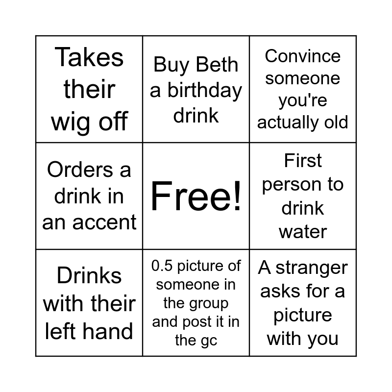 This bingo card has a free space and 29 words: Splits the G, First person to fall over, Baby Guinness shot, Deflated walking stick/walker, Takes their wig off, Convince someone you're actually old, Drinks with their left hand, Posts a selfie in the gc with a stranger, When someone says 'SLAY', Downs their drink, Posts a selfie with Beth in the gc, Get a drink brought for you, Looses a grandma item, First person to dance, A stranger asks what's the occasion, Spills a drink, Gets a 2-4-1 cocktail deal, Gets a free shot, A stranger asks for a picture with you, Orders a glass a wine, First person to bully Megan, Sends a group selfie into the gc, Dance with a stranger, First person to drink water, Orders a drink in an accent, Buy Beth a birthday drink, Let Beth choose your next drink, 0.5 picture of someone in the group and post it in the gc and Gets ID'd.