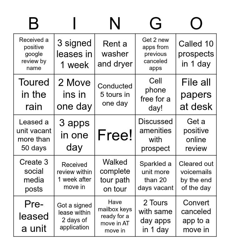 This bingo card has a free space and 24 words: Received review within 1 week after move in, Got a signed lease within 2 days of application, Conducted 5 tours in one day, Pre-leased a unit, Called 10 prospects in 1 day, Received a positive google review by name, Toured in the rain, 3 signed leases in 1 week, Discussed amenities with prospect, Walked complete tour path on tour, Cell phone free for a day!, Leased a unit vacant more than 50 days, Sparkled a unit more than 20 days vacant, Cleared out voicemails by the end of the day, 2 Move ins in one day, 2 Tours with same day apps in 1 day, Get a positive online review, Rent a washer and dryer, File all papers at desk, 3 apps in one day, Convert canceled app to a move in, Create 3 social media posts, Get 2 new apps from previous canceled apps and Have mailbox keys ready for a move in AT move in.