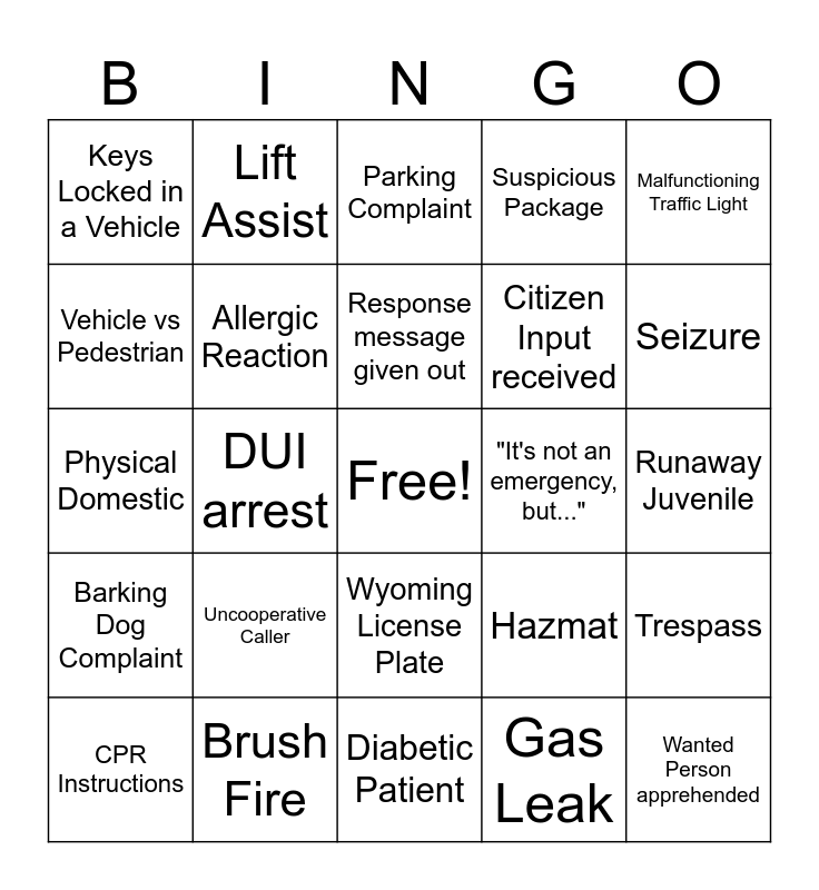 This bingo card has a free space and 29 words: CPR Instructions, Overturned Vehicle, DUI arrest, Medical Alarm, Keys Locked in a Vehicle, Parking Complaint, Allergic Reaction, Uncooperative Caller, "It's not an emergency, but...", Brush Fire, Runaway Juvenile, Wanted Person apprehended, Diabetic Patient, Gas Leak, Seizure, Shoplifter, Wyoming License Plate, Barking Dog Complaint, Malfunctioning Traffic Light, Physical Domestic, Hazmat, Overdose, Citizen Input received, Vehicle vs Pedestrian, Suspicious Package, Lift Assist, Trespass, Response message given out and Smoke or Smell of Smoke.