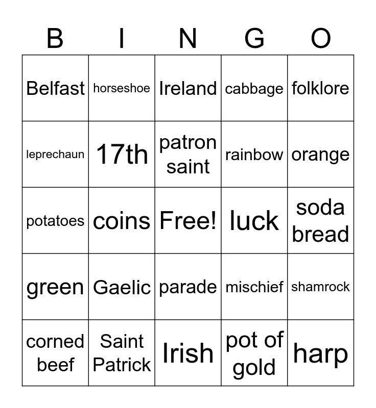 This bingo card has a free space and 28 words: shamrock, clover, rainbow, pot of gold, leprechaun, Ireland, horseshoe, green, luck, corned beef, potatoes, cabbage, Saint Patrick, Irish, orange, white, Gaelic, 17th, patron saint, parade, Belfast, Dublin, harp, coins, soda bread, mischief, folklore and pinch.