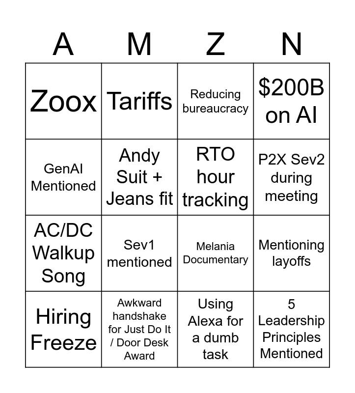 This bingo card has 16 words: Awkward handshake for Just Do It / Door Desk Award, Mentioning layoffs, Reducing bureaucracy, Zoox, AC/DC Walkup Song, Tariffs, Melania Documentary, Using Alexa for a dumb task, GenAI Mentioned, Andy Suit + Jeans fit, Hiring Freeze, $200B on AI, Sev1 mentioned, P2X Sev2 during meeting, RTO hour tracking and 5 Leadership Principles Mentioned.
