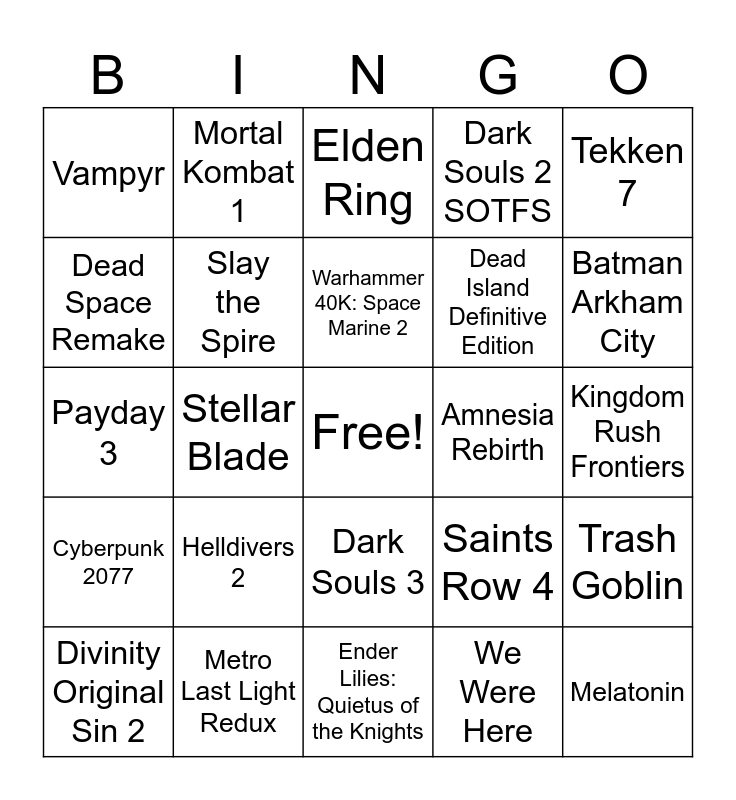 This bingo card has a free space and 29 words: Divinity Original Sin 2, Papers Please, Stellar Blade, Rise of the Tomb Raider, Vampyr, Elden Ring, Slay the Spire, Helldivers 2, Amnesia Rebirth, Metro Last Light Redux, Kingdom Rush Frontiers, Melatonin, Ender Lilies: Quietus of the Knights, We Were Here, Batman Arkham City, The Witcher 2, Dark Souls 3, Cyberpunk 2077, Tekken 7, Payday 3, Saints Row 4, Resident Evil 6, Dead Island Definitive Edition, Dead Space Remake, Dark Souls 2 SOTFS, Mortal Kombat 1, Trash Goblin, Warhammer 40K: Space Marine 2 and The Mortuary Assistant.