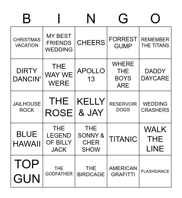 This bingo card has a free space and 68 words: THE MINIONS, FLASHDANCE, THE BODYGUARD, ARMAGEDDON, SUPERMAN, THE MAN WHO KNEW TOO MUCH, MY BEST FRIENDS WEDDING, RISKY BUSINESS, APOLLO 13, OCEANS 11, THE SONNY & CHER SHOW, THE GRADUATE, WEDDING CRASHERS, REMEMBER THE TITANS, HAPPY DAYS, DIRTY DANCIN', THE ROSE, CHRISTMAS VACATION, 9-5, THE LEGEND OF BILLY JACK, WHERE THE BOYS ARE, TITANIC, BLUE HAWAII, SHAWSHANK REDEMPTION, GREASE, MAMMA MIA, SHALLOW HAL, LETHAL WEAPON, WALK THE LINE, NEW YORK NEW YORK, CHEERS, MISSION IMPOSSIBLE, DJANGO UNCHAINED, ROCKY, FORREST GUMP, BACK TO THE FUTURE, SHREK 2, TOP GUN, DADDY DAYCARE, JAILHOUSE ROCK, THE SANDLOT, BEACHES, THE WAY WE WERE, SONS OF ANARCHY, WAYNE'S WORLD, THE WIZARD OF OZ, TO SIR WITH LOVE, 3 MEN AND A BABY, RESERVOIR DOGS, THE GODFATHER, HELLO DOLLY, URBAN COWBOY, DIARY OF A WIMPY KID, THE BIRDCAGE, SMOKEY AND THE BANDIT, FOOT LOOSE, AMERICAN GRAFITTI, GHOST, THERE'S SOMETHING ABOUT MARY, BUTCH CASSIDY & THE SUNDANCE KID, THE SPY WHO LOVED ME, RAINMAN, WELCOME BACK KOTTER, THE MULE, ON GOLDEN POND, POSEIDON ADVENTURE, PSYCHO and FEAR FACTOR.