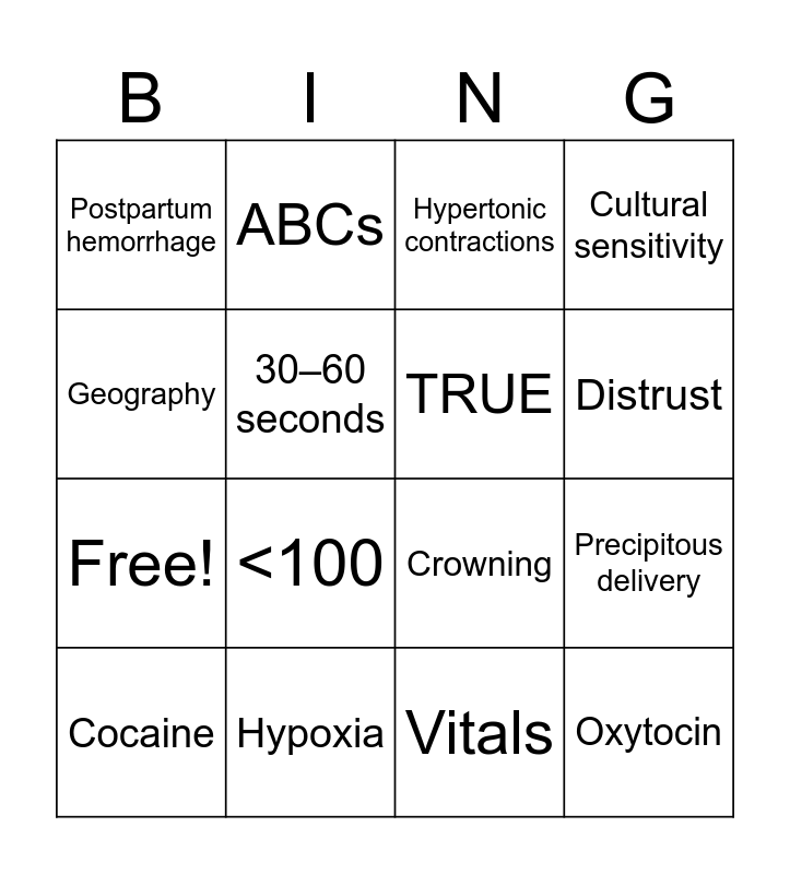 This bingo card has 1 images and 19 words: Precipitous delivery, 3%, Hypertonic contractions, Low resistance, Cocaine, Geography, Hypoxia, Postpartum hemorrhage, Free!, ABCs, <100, Crowning, 30–60 seconds, Oxytocin, TRUE, Dorsal lithotomy, Distrust, Cultural sensitivity and Vitals.