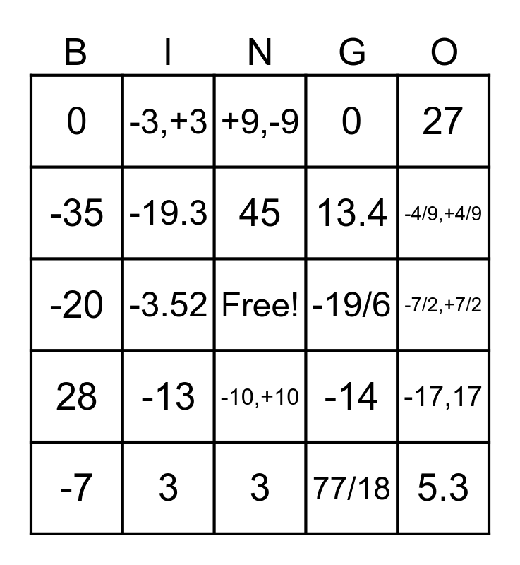 This bingo card has a free space and 24 words: -13, 3, 45, -7, 27, 0, -35, -3,+3, -19/6, -10,+10, 13.4, -20, -14, -17,17, -19.3, 77/18, -7/2,+7/2, +9,-9, -4/9,+4/9, -3.52, 5.3, 28, 0 and 3.