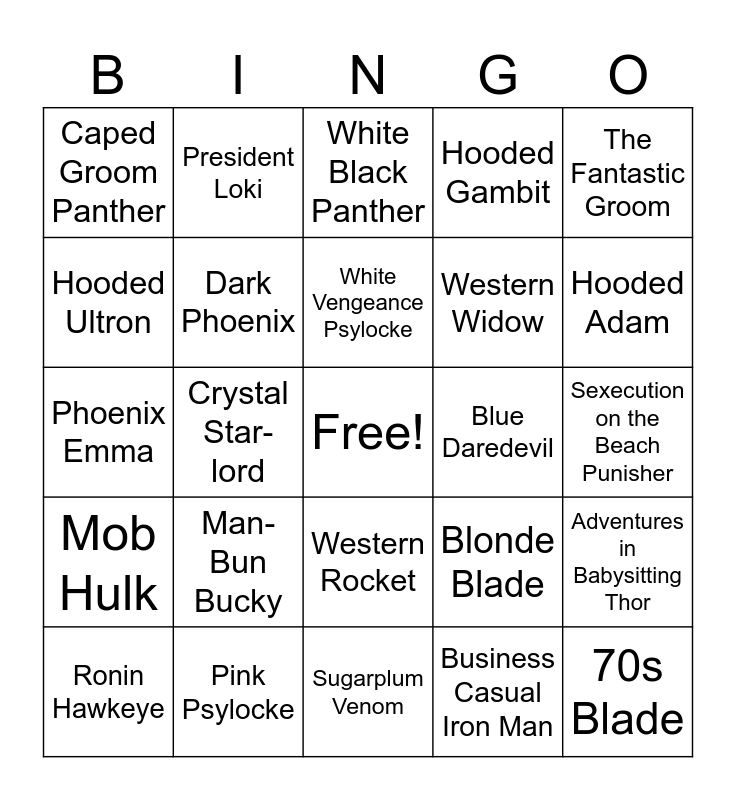 This bingo card has a free space and 69 words: Beach Body Thor, Sexecution on the Beach Punisher, Disco Sue, Red Bonnet Psylocke, Pink Psylocke, The Rogue Bride, Hooded Gambit, The Invisible Bride, The Fantastic Groom, Dadtastic Reed, Adventures in Babysitting Thor, Black Moon Knight, Caped Groom Panther, White Black Panther, Mohawk Storm, Crystal Star-lord, Western Rocket, Western Widow, Western Wolverine, Mob Hulk, Blue Daredevil, Blonde Blade, Hooded Adam, Pink Angela, Masquerade Cloak and Dagger, Astral Strange, Lion Fist, Disco Death Hela, Business Casual Iron Man, Pink Winter Jeff, President Loki, Punk Magik, Classic Magneto, Green Mantis, Gray Scarlet Witch, Gray Squirrel Girl, Iron Spider, Trenchcoat Thing, Hooded Ultron, White Venom, Man-Bun Bucky, 70s Blade, Blue Groot, Gray Deadpool, Winter Peni, Ronin Hawkeye, Green Luna, Purple Peni, Red Cake Sue, Dark Phoenix, White Vengeance Psylocke, Panda Rocket, Ugly Phoenix Luna, Sugarplum Venom, MCU Bucky, MCU Thor, MCU Star-lord, Phoenix Scarlet Witch, Scarlet Witch Phoenix, Phoenix Emma, Spider-Punk, X-uniform Namor, Savage Sub-mariner, Autumn Loki, Medusa Hela, Trenchcoat Strange, Red and Black Sue, Franken-Castle and MCU Scarlet Witch.
