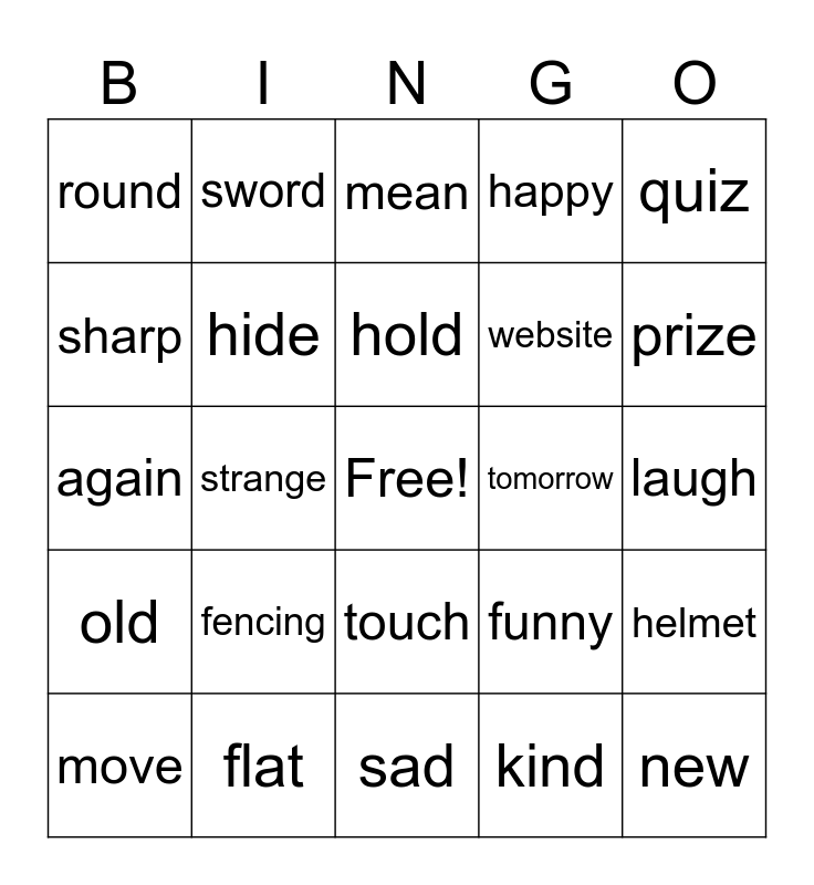 This bingo card has a free space and 24 words: fencing, flat, hold, move, quiz, round, sharp, sword, tomorrow, touch, website, again, funny, helmet, hide, kind, laugh, mean, prize, strange, new, old, happy and sad.