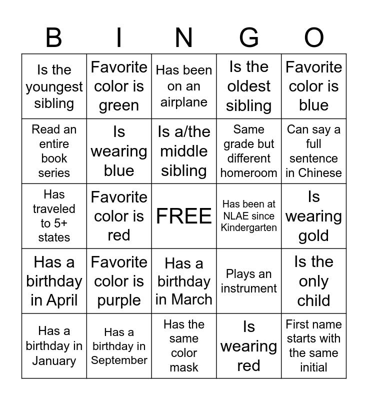 This bingo card has a free space and 49 words: Same homeroom class, First name starts with the same initial, Has attended another school other than NLAE, Has the same color mask, Favorite color is purple, Has a sibling at NLAE, Favorite color is green, Same birthday month, Read an entire book series, Is wearing green, Is wearing blue, Is the oldest sibling, Is the only child, Plays an instrument, Favorite color is orange, Is wearing purple, Is a/the middle sibling, Has been at NLAE since Kindergarten, Has a pet, Favorite color is blue, Favorite color is red, Is wearing red, Is the youngest sibling, Same grade but different homeroom, Participates in an after school activity, Can say a full sentence in Chinese, Has a birthday in January, Has a birthday in February, Has a birthday in March, Has a birthday in April, Has a birthday in May, Has a birthday in June, Has a birthday in July, Has a birthday in August, Has a birthday in September, Has a birthday in October, Has a birthday in November, Has a birthday in December, Is wearing gold, Favorite color is yellow, Same favorite food, Is left-handed, Doesn't like pizza, Plays video / computer games, Has traveled to 5+ states, Has been on an airplane, Has been on a boat, Has been on a train and Has been to an amusement park.