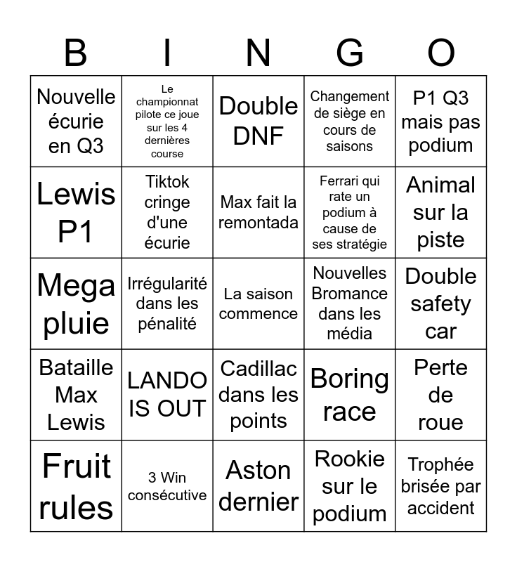 This bingo card has a free space and 24 words: LANDO IS OUT, 3 Win consécutive, Max fait la remontada, Fruit rules, P1 Q3 mais pas podium, Nouvelle écurie en Q3, Lewis P1, Le championnat pilote ce joue sur les 4 dernières course, Nouvelles Bromance dans les média, Cadillac dans les points, Ferrari qui rate un podium à cause de ses stratégie, Mega pluie, Boring race, Perte de roue, Tiktok cringe d'une écurie, Rookie sur le podium, Double safety car, Double DNF, Animal sur la piste, Irrégularité dans les pénalité, Trophée brisée par accident, Bataille Max Lewis, Changement de siège en cours de saisons and Aston dernier.