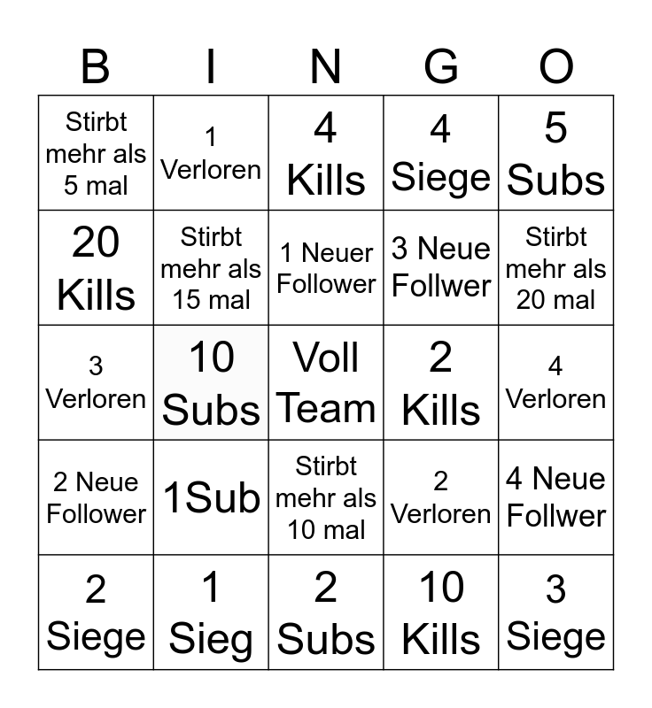 This bingo card has a free space and 24 words: 1Sub, 1 Sieg, 1 Neuer Follower, 2 Siege, 5 Subs, Stirbt mehr als 5 mal, 20 Kills, 1 Verloren, 2 Kills, Stirbt mehr als 10 mal, 3 Neue Follwer, 3 Verloren, 2 Verloren, 4 Neue Follwer, Stirbt mehr als 15 mal, 10 Kills, 4 Verloren, 4 Kills, Stirbt mehr als 20 mal, 10 Subs, 3 Siege, 2 Neue Follower, 4 Siege and 2 Subs.