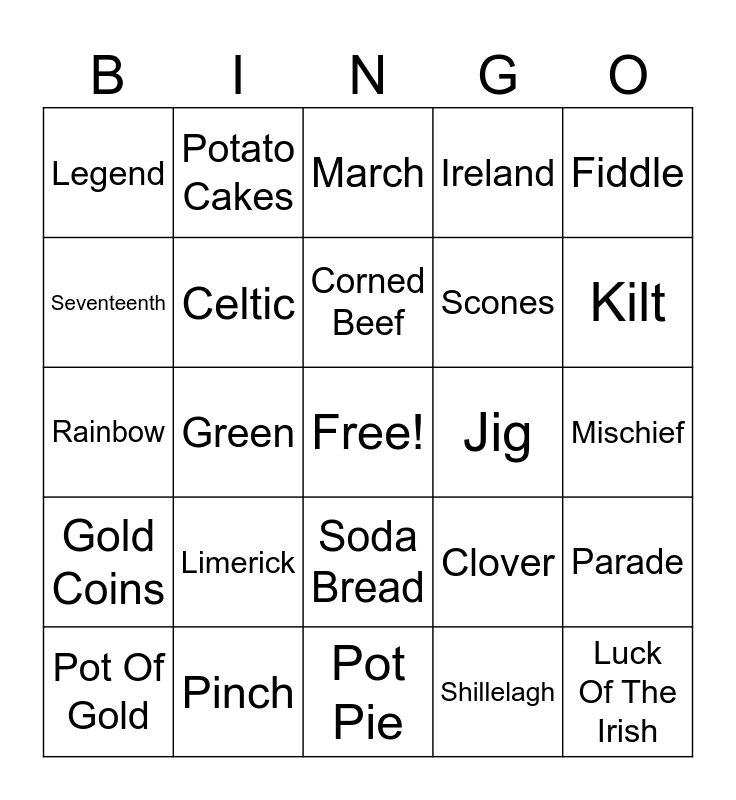 This bingo card has a free space and 36 words: Bagpipe, Blarney, Bog, Celtic, Clover, Gold Coins, Corned Beef, Feast Of Saint Patrick, Fiddle, Four Leaf Clover, Green, Ireland, Irish Stew, Jig, Kilt, Legend, Leprechaun, Limerick, Luck Of The Irish, March, Mischief, Parade, Pinch, Pot Of Gold, Pot Pie, Potato Cakes, Rainbow, Rugby, Scones, Seventeenth, Shamrock, Shepard’s Pie, Shillelagh, Soda Bread, St. Patrick and Wee.