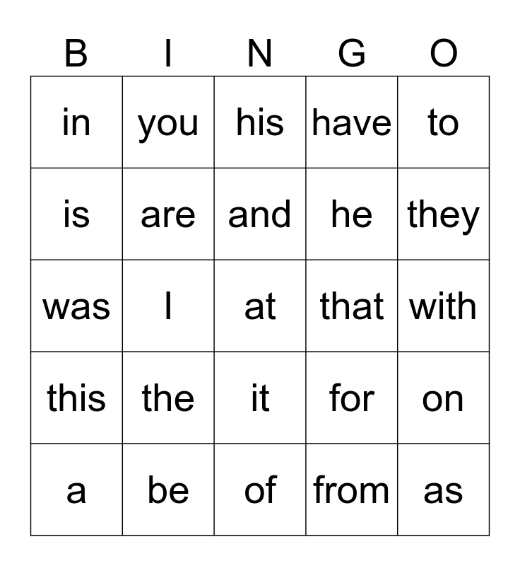 This bingo card has 25 words: the, of, and, a, to, in, is, you, that, it, he, was, for, on, are, as, with, his, they, I, at, be, this, have and from.