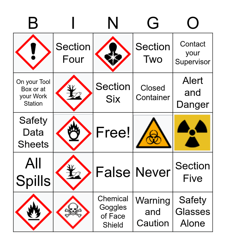This bingo card has 11 images, a free space and 18 words: Safety Glasses Alone, Chemical Goggles of Face Shield, Warning and Caution, Alert and Danger, True, False, All Spills, Contact your Supervisor, Safety Data Sheets, Never, Section Eight, Closed Container, On your Tool Box or at your Work Station, Section Two, Section Four, Section Five, Section Six and Section Thirteen.