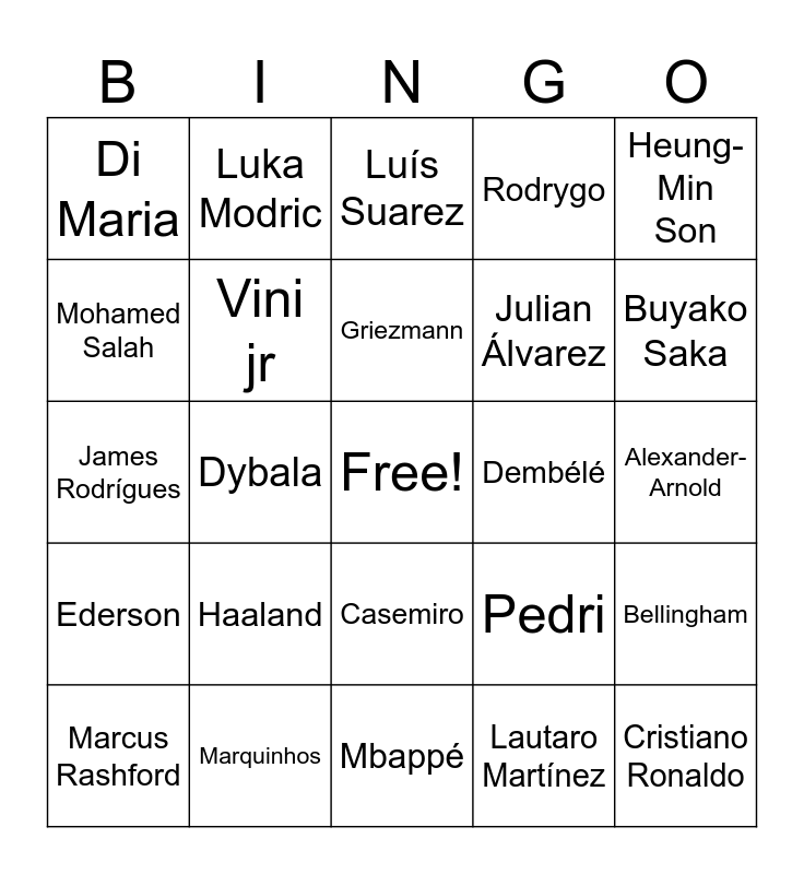 This bingo card has a free space and 49 words: Lionel Messi, Cristiano Ronaldo, Neymar, Mbappé, Haaland, De Bruyne, Luka Modric, Benzema, Mohamed Salah, Harry Kane, Vini jr, Rodrygo, Bellingham, Pedri, Gavi, Lewandowski, Griezmann, Dembélé, Sadio Mané, Heung-Min Son, Dybala, Lautaro Martínez, Di Maria, Julian Álvarez, Phil Foden, Buyako Saka, Marcus Rashford, Bruno Fernandes, Casemiro, Ederson, Van Dijk, Sergio Ramos, Gerard Piqué, Thiago Silva, Marquinhos, João Cancelo, Hakimi, Theo Hernández, Alexander-Arnold, Kimmich, Goretzka, Thomas Müller, Toni Kross, Marco Reus, James Rodrígues, Luís Suarez, Edison Cavani, Zlatan Ibrahimovic and Ronaldinho Gaúcho.