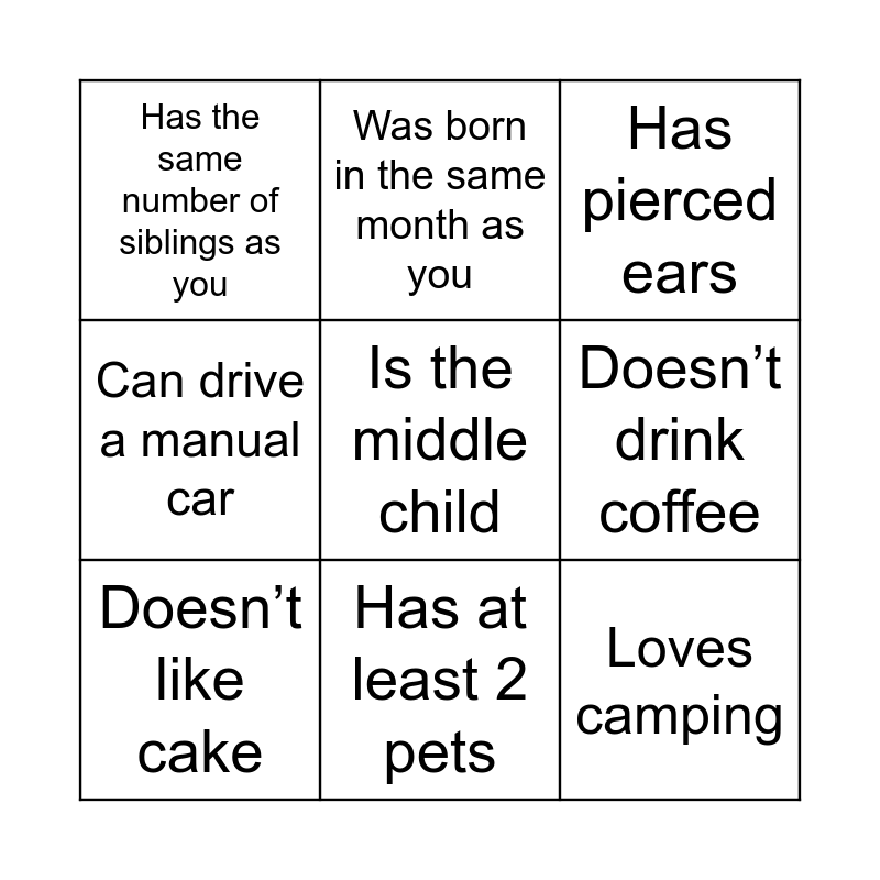 This bingo card has 25 words: Speaks another language, Has lived in another country, Has at least 2 pets, Enjoys gardening, Is the middle child, Has the same number of siblings as you, Doesn’t drink coffee, Was born in the same month as you, Likes baking, Likes to wake up early, Loves camping, Prefers winter over summer, Has never broken a bone, Has worked here for more than 3 years, Doesn’t like cake, Is afraid of snakes, Has the same eye colour as you, Has pierced ears, Has skydived or bungee jumped, Plays an instrument, Has been overseas in the last 6 months, Can do a cartwheel (no demonstration needed), Has been in a helicopter, Can drive a manual car and Likes pineapple on a pizza.