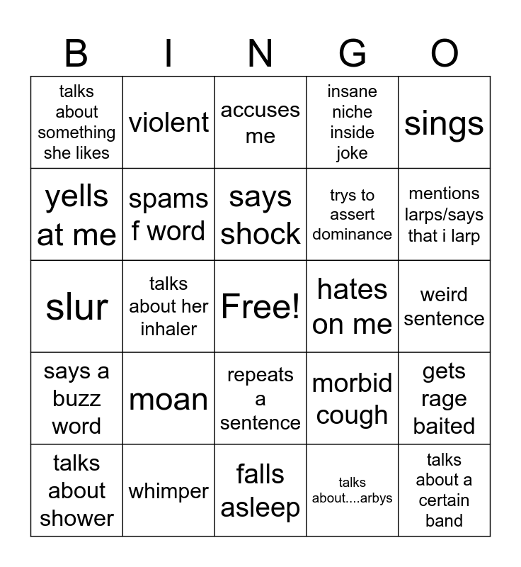This bingo card has a free space and 24 words: moan, whimper, says shock, talks about shower, sings, talks about something she likes, yells at me, violent, hates on me, repeats a sentence, trys to assert dominance, slur, morbid cough, gets rage baited, spams f word, talks about....arbys, weird sentence, accuses me, mentions larps/says that i larp, talks about her inhaler, talks about a certain band, says a buzz word, insane niche inside joke and falls asleep.