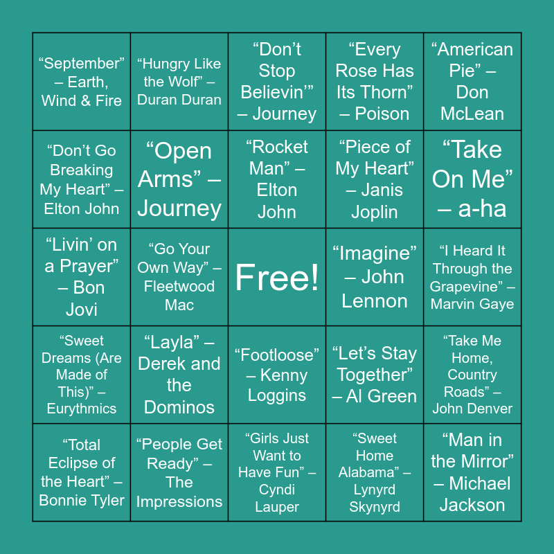 This bingo card has a free space and 100 words: “Respect” – Aretha Franklin, “Hey Jude” – The Beatles, “I Heard It Through the Grapevine” – Marvin Gaye, “My Girl” – The Temptations, “(Sittin’ On) The Dock of the Bay” – Otis Redding, “Good Vibrations” – The Beach Boys, “Stand by Me” – Ben E. King, “A Change Is Gonna Come” – Sam Cooke, “Twist and Shout” – The Beatles, “Light My Fire” – The Doors, “I Want to Hold Your Hand” – The Beatles, “For What It’s Worth” – Buffalo Springfield, “California Dreamin’” – The Mamas & the Papas, “People Get Ready” – The Impressions, “Build Me Up Buttercup” – The Foundations, “You Can’t Hurry Love” – The Supremes, “Piece of My Heart” – Janis Joplin, “House of the Rising Sun” – The Animals, “I Got You (I Feel Good)” – James Brown, “Runaround Sue” – Dion, “Bohemian Rhapsody” – Queen, “Hotel California” – Eagles, “Superstition” – Stevie Wonder, “Stayin’ Alive” – Bee Gees, “Dream On” – Aerosmith, “Imagine” – John Lennon, “American Pie” – Don McLean, “Let’s Stay Together” – Al Green, “Dancing Queen” – ABBA, “Le Freak” – Chic, “Go Your Own Way” – Fleetwood Mac, “September” – Earth, Wind & Fire, “We Will Rock You” – Queen, “I Will Survive” – Gloria Gaynor, “Sweet Home Alabama” – Lynyrd Skynyrd, “Rocket Man” – Elton John, “Take Me Home, Country Roads” – John Denver, “Let It Be” – The Beatles, “Bridge Over Troubled Water” – Simon & Garfunkel, “Piano Man” – Billy Joel, “Billie Jean” – Michael Jackson, “Like a Prayer” – Madonna, “Livin’ on a Prayer” – Bon Jovi, “Sweet Child O’ Mine” – Guns N’ Roses, “Take On Me” – a-ha, “Don’t Stop Believin’” – Journey, “Purple Rain” – Prince, “With or Without You” – U2, “Eye of the Tiger” – Survivor, “Girls Just Want to Have Fun” – Cyndi Lauper, “Every Breath You Take” – The Police, “Wake Me Up Before You Go-Go” – Wham!, “Africa” – Toto, “Another One Bites the Dust” – Queen, “Beat It” – Michael Jackson, “Time After Time” – Cyndi Lauper, “The Final Countdown” – Europe, “Jump” – Van Halen, “Careless Whisper” – George Michael, “Every Rose Has Its Thorn” – Poison, “Brown Eyed Girl” – Van Morrison, “Mrs. Robinson” – Simon & Garfunkel, “Suspicious Minds” – Elvis Presley, “Proud Mary” – Creedence Clearwater Revival, “Bad Moon Rising” – Creedence Clearwater Revival, “Be My Baby” – The Ronettes, “Unchained Melody” – The Righteous Brothers, “Son of a Preacher Man” – Dusty Springfield, “Chain of Fools” – Aretha Franklin, “Crimson and Clover” – Tommy James & the Shondells, “Space Oddity” – David Bowie, “Layla” – Derek and the Dominos, “Maggie May” – Rod Stewart, “Bennie and the Jets” – Elton John, “Tiny Dancer” – Elton John, “Rhiannon” – Fleetwood Mac, “Dreams” – Fleetwood Mac, “Don’t Go Breaking My Heart” – Elton John, “Sir Duke” – Stevie Wonder, “Lovely Day” – Bill Withers, “Take My Breath Away” – Berlin, “Man in the Mirror” – Michael Jackson, “I Wanna Dance with Somebody” – Whitney Houston, “Footloose” – Kenny Loggins, “Faith” – George Michael, “Hungry Like the Wolf” – Duran Duran, “Summer of ’69” – Bryan Adams, “Walking on Sunshine” – Katrina and the Waves, “Don’t You (Forget About Me)” – Simple Minds, “Sweet Dreams (Are Made of This)” – Eurythmics, “Pour Some Sugar on Me” – Def Leppard, “Jessie’s Girl” – Rick Springfield, “Nothing’s Gonna Stop Us Now” – Starship, “Total Eclipse of the Heart” – Bonnie Tyler, “Open Arms” – Journey, “Alone” – Heart, “Down Under” – Men at Work, “You Give Love a Bad Name” – Bon Jovi, “True Colors” – Cyndi Lauper and “Everybody Wants to Rule the World” – Tears for Fears.