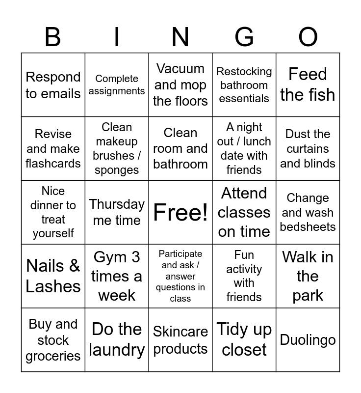 This bingo card has a free space and 24 words: Gym 3 times a week, Do the laundry, Clean room and bathroom, Buy and stock groceries, Feed the fish, Respond to emails, Revise and make flashcards, Complete assignments, Attend classes on time, Participate and ask / answer questions in class, A night out / lunch date with friends, Nice dinner to treat yourself, Fun activity with friends, Walk in the park, Clean makeup brushes / sponges, Tidy up closet, Change and wash bedsheets, Vacuum and mop the floors, Dust the curtains and blinds, Thursday me time, Duolingo, Nails & Lashes, Restocking bathroom essentials and Skincare products.