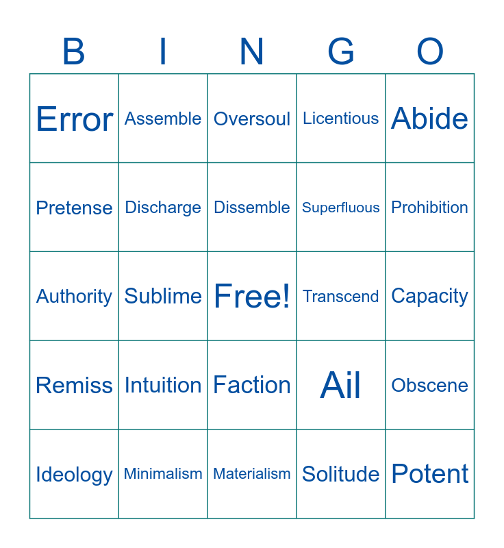 This bingo card has a free space and 24 words: Intuition, Minimalism, Dissemble, Ideology, Abide, Error, Pretense, Assemble, Transcend, Faction, Superfluous, Authority, Ail, Obscene, Discharge, Solitude, Capacity, Oversoul, Prohibition, Sublime, Potent, Remiss, Licentious and Materialism.