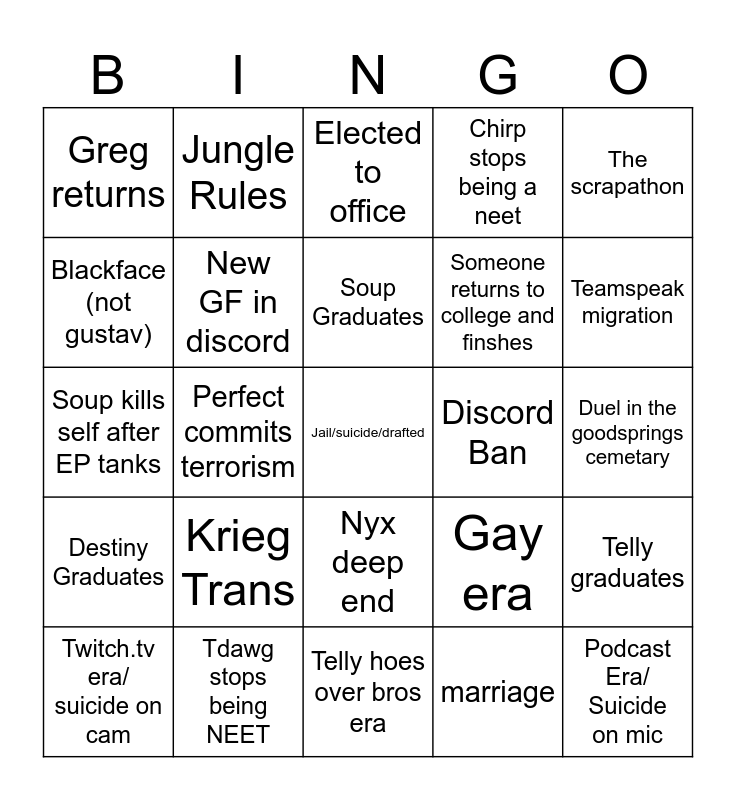 This bingo card has a free space and 24 words: Krieg Trans, Tdawg stops being NEET, Soup Graduates, Twitch.tv era/ suicide on cam, The scrapathon, Greg returns, Blackface (not gustav), Jungle Rules, Discord Ban, Nyx deep end, Someone returns to college and finshes, Soup kills self after EP tanks, Gay era, Telly graduates, New GF in discord, marriage, Duel in the goodsprings cemetary, Elected to office, Teamspeak migration, Perfect commits terrorism, Podcast Era/ Suicide on mic, Destiny Graduates, Chirp stops being a neet and Telly hoes over bros era.