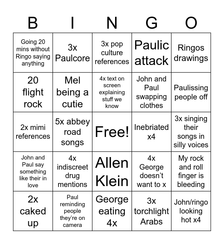 This bingo card has a free space and 24 words: 4x indiscreet drug mentions, Paul reminding people they’re on camera, 4x text on screen explaining stuff we know, 2x caked up, Ringos drawings, Going 20 mins without Ringo saying anything, 20 flight rock, 3x Paulcore, Inebriated x4, Allen Klein, John and Paul swapping clothes, 2x mimi references, 4x George doesn’t want to x, My rock and roll finger is bleeding, Mel being a cutie, 3x torchlight Arabs, 3x singing their songs in silly voices, 3x pop culture references, Paulissing people off, 5x abbey road songs, John/ringo looking hot x4, John and Paul say something like their in love, Paulic attack and George eating 4x.