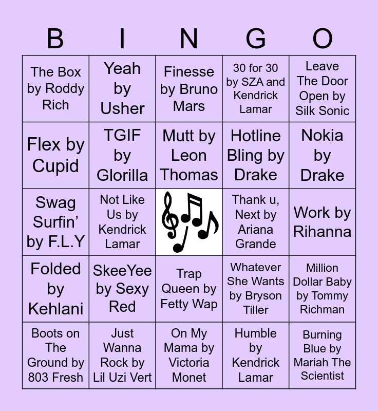 This bingo card has a free space and 24 words: SkeeYee by Sexy Red, Just Wanna Rock by Lil Uzi Vert, Mutt by Leon Thomas, Boots on The Ground by 803 Fresh, Leave The Door Open by Silk Sonic, The Box by Roddy Rich, Flex by Cupid, Yeah by Usher, Thank u, Next by Ariana Grande, Trap Queen by Fetty Wap, Hotline Bling by Drake, Swag Surfin’ by F.L.Y, Whatever She Wants by Bryson Tiller, Million Dollar Baby by Tommy Richman, TGIF by Glorilla, Humble by Kendrick Lamar, Work by Rihanna, Finesse by Bruno Mars, Nokia by Drake, Not Like Us by Kendrick Lamar, Burning Blue by Mariah The Scientist, Folded by Kehlani, 30 for 30 by SZA and Kendrick Lamar and On My Mama by Victoria Monet.