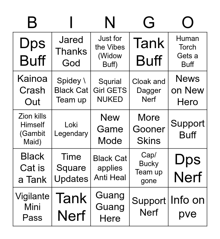 This bingo card has 25 words: Black Cat is a Tank, Tank Nerf, New Game Mode, Support Nerf, Human Torch Gets a Buff, Dps Buff, Jared Thanks God, Just for the Vibes (Widow Buff), More Gooner Skins, Dps Nerf, Kainoa Crash Out, Spidey \ Black Cat Team up, Guang Guang Here, Cap/ Bucky Team up gone, News on New Hero, Vigilante Mini Pass, Loki Legendary, Squrial Girl GETS NUKED, Cloak and Dagger Nerf, Support Buff, Zion kills Himself (Gambit Maid), Time Square Updates, Black Cat applies Anti Heal, Tank Buff and Info on pve.