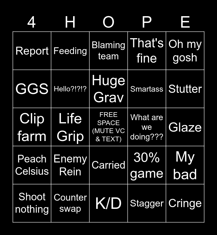This bingo card has a free space and 61 words: I played well, Counter swap, Tank iff, Peach Celsius, Stagger, Crazy aim, Hello?!?!?, Malding, Smartass, Blame DPS, That's fine, Chat troll, GGS, VOD review, Massive ult, Report, Cringe, Oh my gosh, Unemployed, Huge Grav, What are we doing???, Blaming team, Shoot nothing, My bad, Miss Flux, No healing, ?????????, White Monster, Stutter, Off map, Miss Rock, No charge, Unfortunate, Plat, Feeding, Lie, Laugh, Life Grip, Gives team advice, Clip farm, DC, Enemy Rein, Glaze, Die in ult, 30% game, Fake C9, Blame Mercy, Smurf, Go next, Carried, K/D, Crashout, Slept, Airball, Solo Shatter, Good play, Leaver, Sigh, Ban chatter, Stream sniper and Tough one.