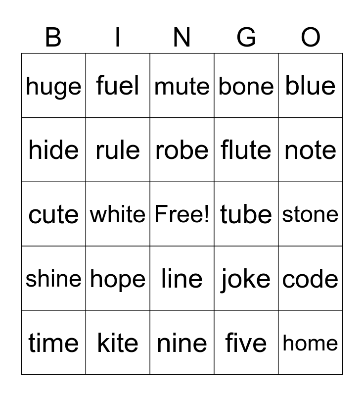 This bingo card has a free space and 45 words: bike, home, cube, time, rope, five, mute, nose, blue, kite, bone, tube, line, hope, glue, nine, phone, cute, rice, note, fuel, smile, rose, huge, slide, stone, use, pipe, joke, shine, rude, code, prize, hole, true, white, smoke, June, drive, robe, hide, flute, close, rule and prune.