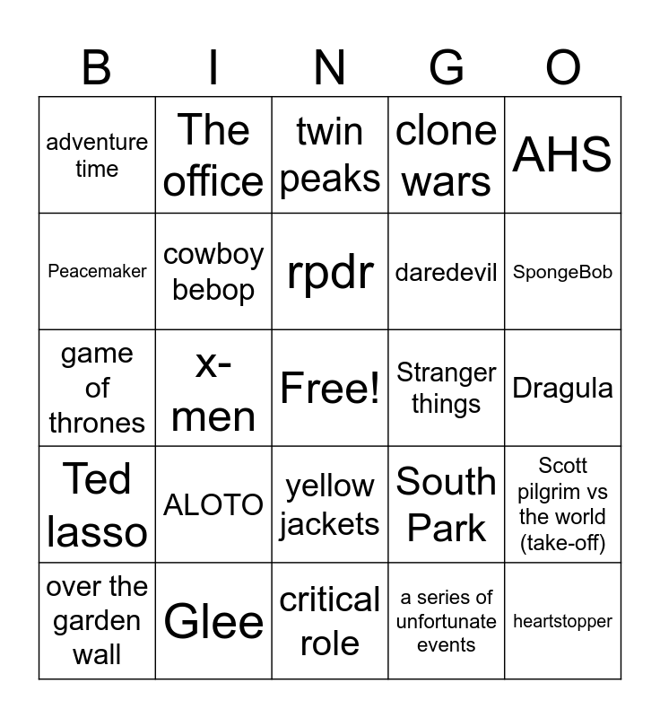 This bingo card has a free space and 24 words: ALOTO, Glee, rpdr, over the garden wall, AHS, adventure time, Peacemaker, The office, Stranger things, yellow jackets, daredevil, game of thrones, South Park, Scott pilgrim vs the world (take-off), cowboy bebop, a series of unfortunate events, Dragula, twin peaks, SpongeBob, x-men, heartstopper, Ted lasso, clone wars and critical role.