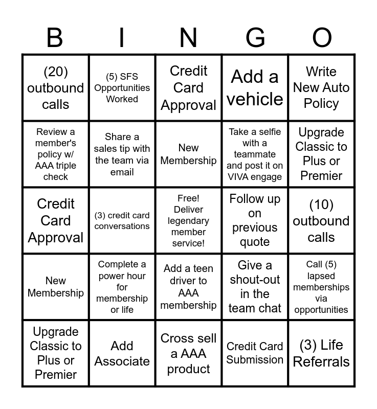 This bingo card has a free space and 24 words: Upgrade Classic to Plus or Premier, Complete a power hour for membership or life, New Membership, Credit Card Submission, Write New Auto Policy, (20) outbound calls, (5) SFS Opportunities Worked, Credit Card Approval, Follow up on previous quote, (10) outbound calls, Credit Card Approval, Share a sales tip with the team via email, Give a shout-out in the team chat, Call (5) lapsed memberships via opportunities, Review a member's policy w/ AAA triple check, Add Associate, Cross sell a AAA product, Add a vehicle, Upgrade Classic to Plus or Premier, New Membership, (3) credit card conversations, Add a teen driver to AAA membership, Take a selfie with a teammate and post it on VIVA engage and (3) Life Referrals.