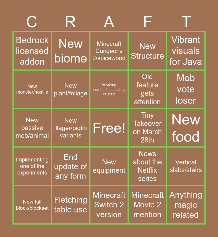 This bingo card has a free space and 24 words: End update of any form, Fletching table use, Anything combat/enchanting related, New full block/blockset, Vibrant visuals for Java, Bedrock licensed addon, New monster/hostile, New biome, Tiny Takeover on March 28th, New equipment, Old feature gets attention, New passive mob/animal, News about the Netflix series, Vertical slabs/stairs, New plant/foliage, Minecraft Movie 2 mention, New food, Minecraft Dungeons 2/spicewood, Mob vote loser, New illager/piglin variants, Anything magic related, Implementing one of the experiments, New Structure and Minecraft Switch 2 version.